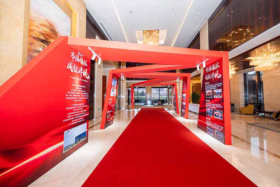 5. 品牌展示:發布會是展示企業形象和品牌的機會,要將企業的標志、口號、產品等元素融入到布置中。可以設計專門的展示區域或展示墻,展示企業的成就、產品特點等內容。